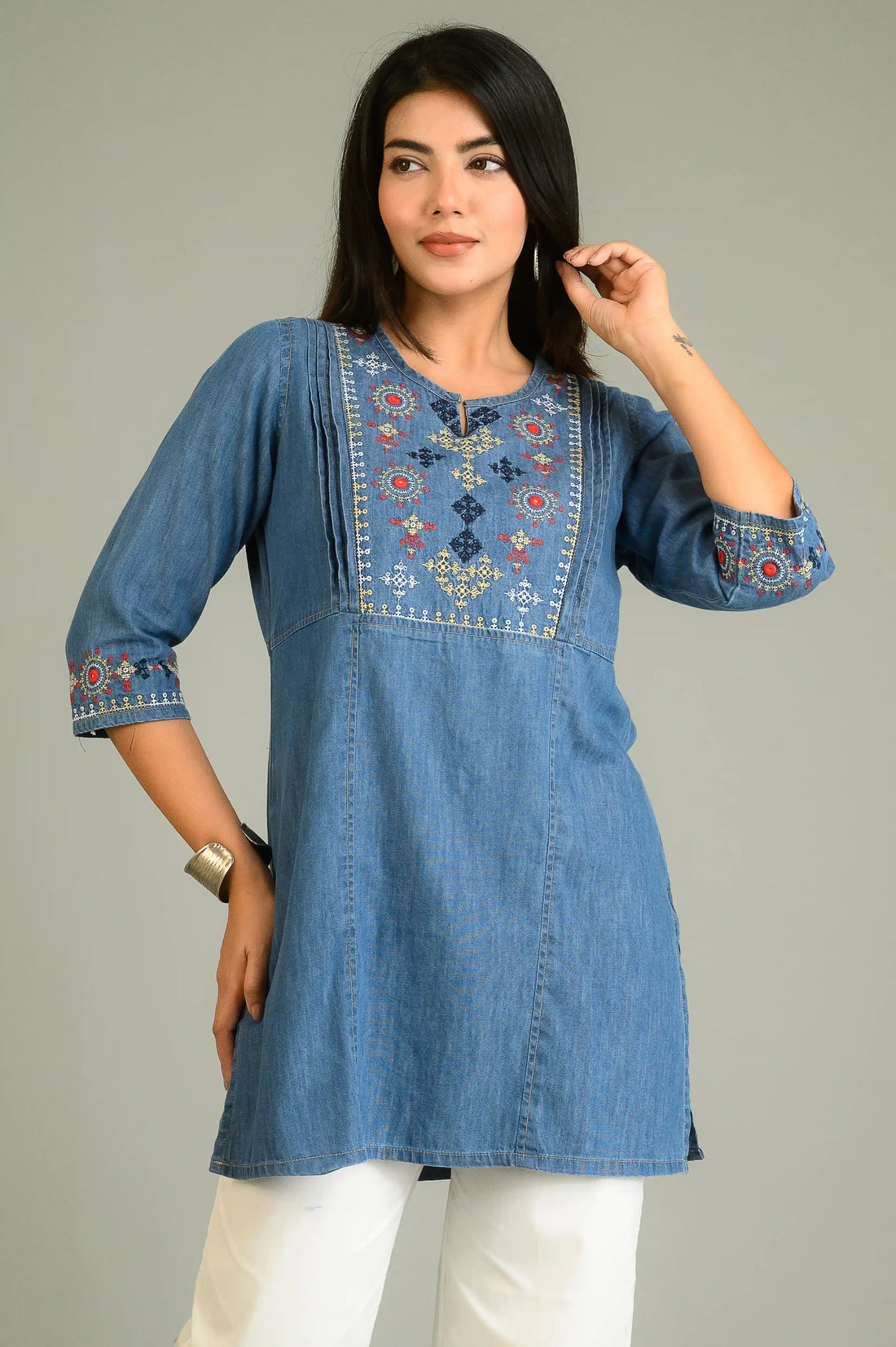 Product Details This denim top beautifully blends tradition with trend — featuring exquisite Sindhi Taka...